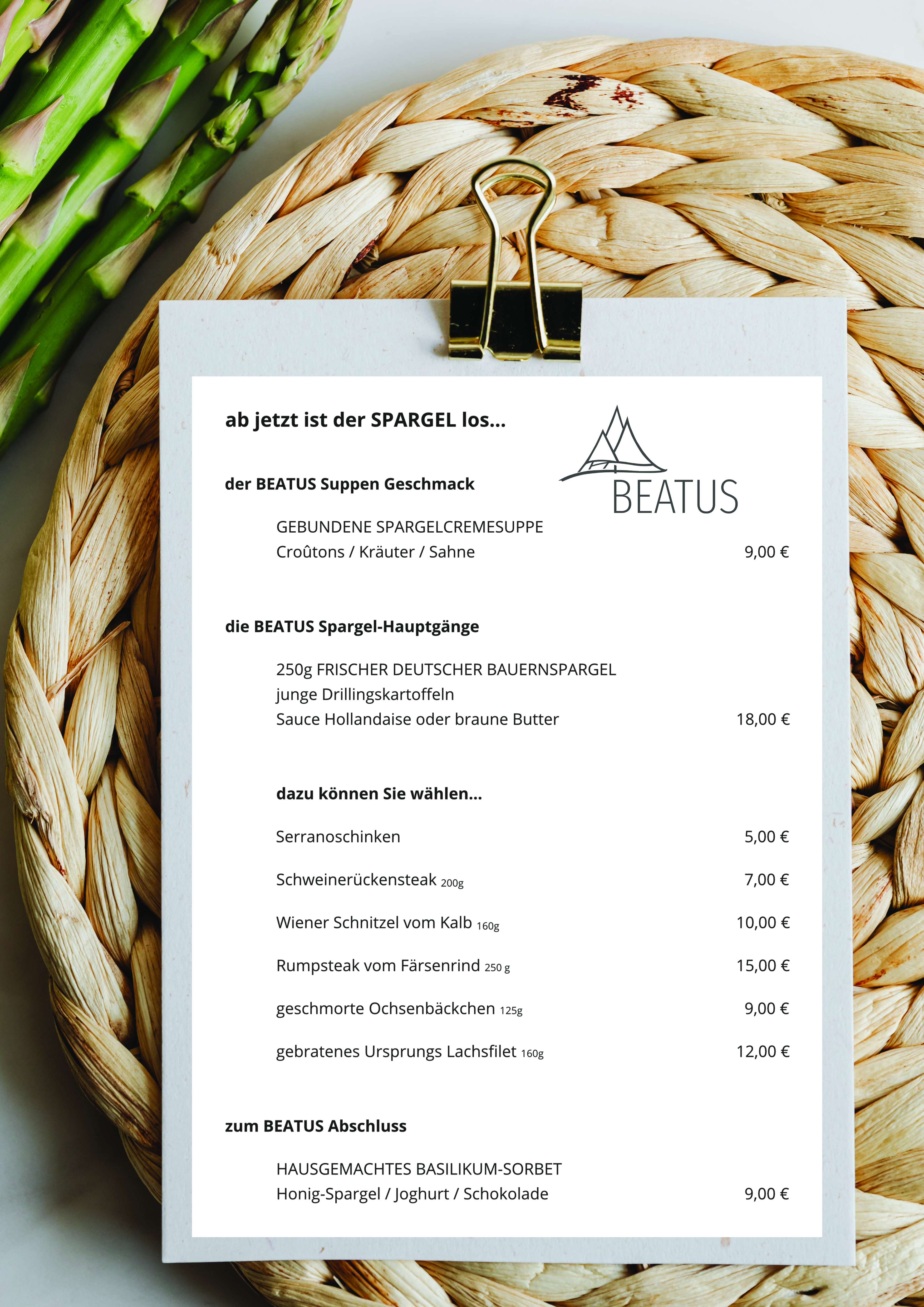 Während der Spargelzeit genießen Sie in unserem Restaurant BEATUS frischen deutschen Spargel. Zum Start empfehlen wir Ihnen eine frische Spargelcremesuppe mit Röstbrot.